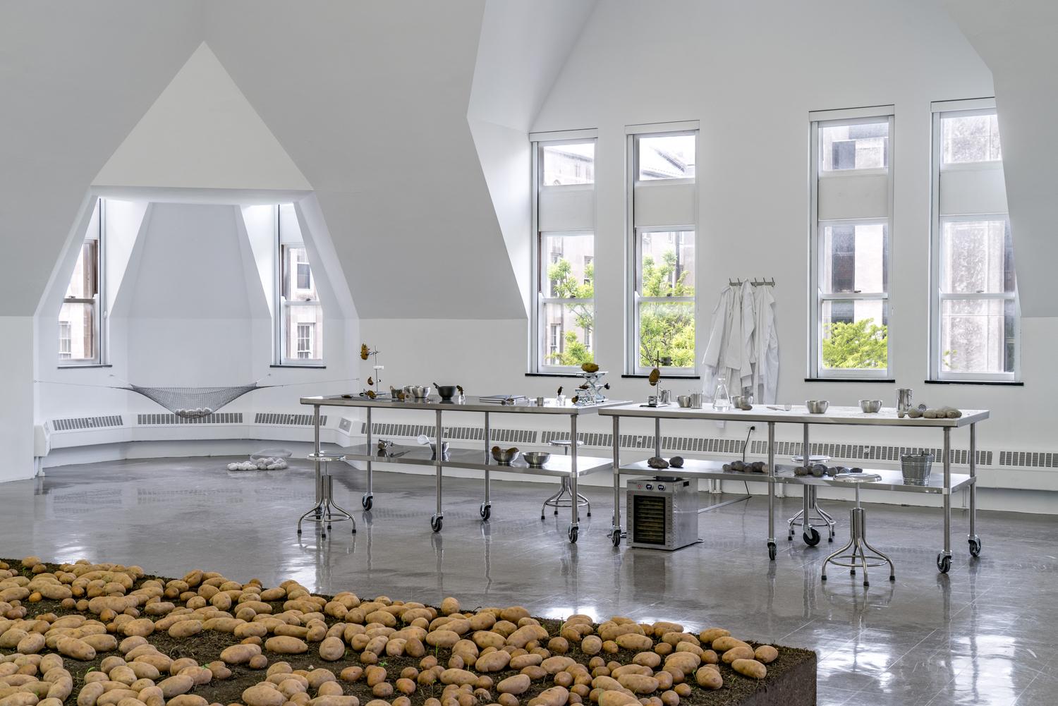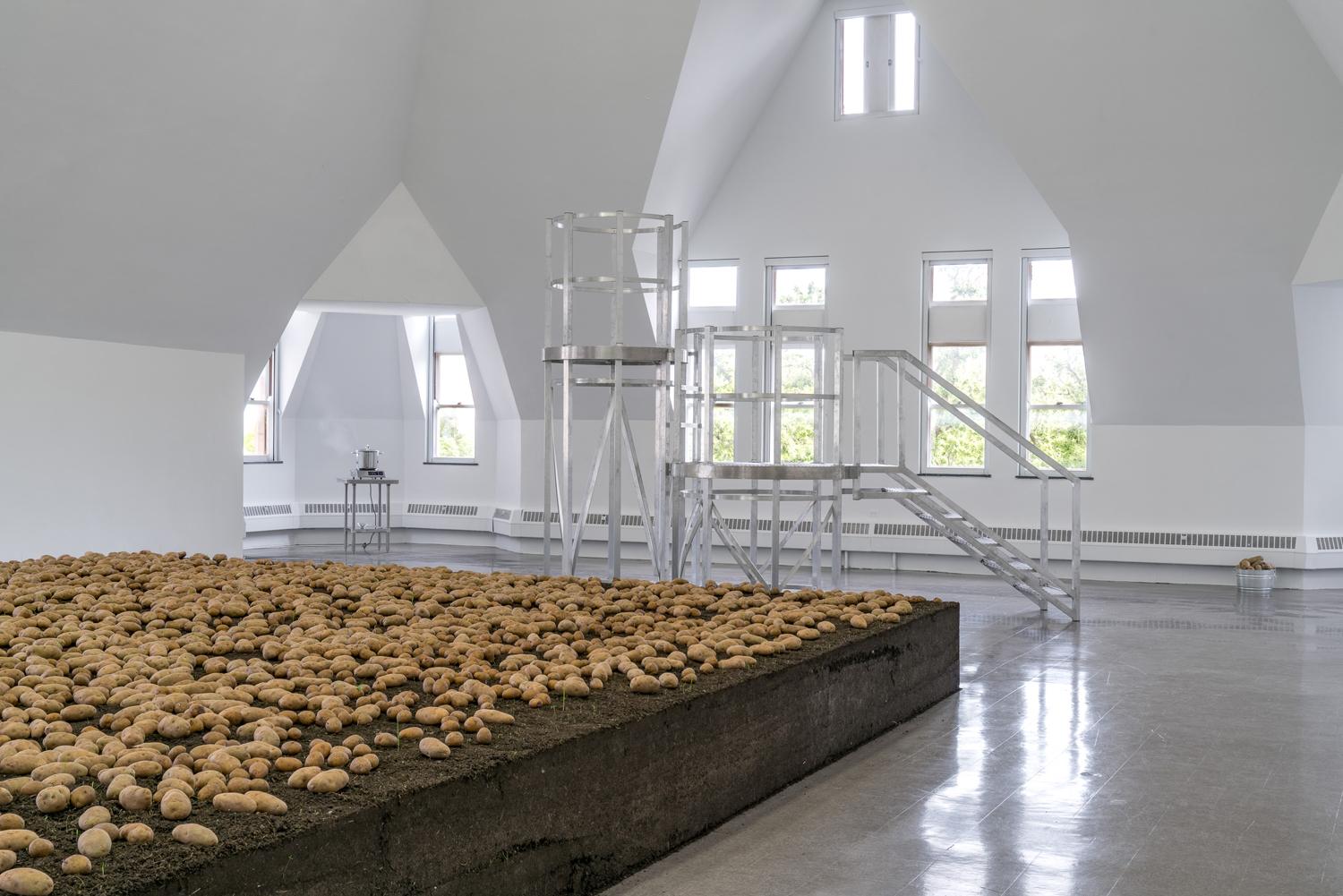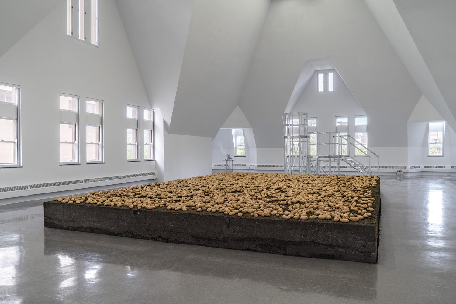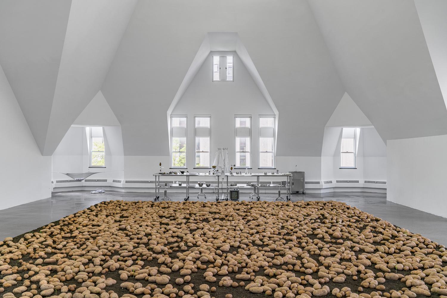 For a new large-scale project at the Renaissance Society, Germinations, Garrido-Lecca continues her research into plants originally domesticated by Andean and Mesoamerican cultures and their subsequent global dissemination. Taking center stage here is Solanum tuberosum, a tuber known in many places as the potato. Domesticated more than 8,000 years ago in the Altiplano region, the potato has been a pillar in the lives of Andean communities, where it is grown as a source of sustenance and attributed symbolic and spiritual value. Today, more than 4,000 potato varieties exist in Peru alone, and it has been adapted to different altitudes and climatic conditions around the world.